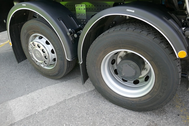La variante 6×2 à hydrogène conserve l’ancienne cabine et surtout son panneau arrière qui trouve sa pleine et entière justification dans le cas du modèle à pile à combustible. Dans l’espace initialement dévolu au moteur thermique, on trouve désormais les quatre réservoirs à hydrogène, ce qui représente 20kg de gaz embarqué (sous 350 bars de pression) plus la pile à combustible. Ce modèle, au stade de la preuve de concept, effectue des tournées pour différentes collectivités et entreprises faisant de la collecte d’ordures ménagères. Les premiers tests clients à grande échelle sont envisagés pour début 2025.