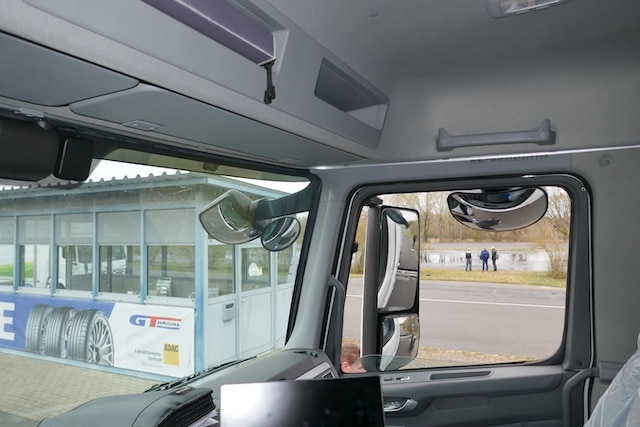 La finition est typique … des voitures Hyundai. C’est-à-dire sans reproches. Le revêtement en plastique moussé est plutôt valorisant. Concernant le bloc instrumentation , le choix d’un affichage analogique et numérique est bienvenu car il facilite la lecture. La cabine est dépourvue de couchette mais suffisamment profonde pour que l’on puisse y trouver ses aises pour la course d’assise de siège comme l’inclinaison de dossier grâce à la cloison arrière suffisamment reculée. La mise en route s’effectue via un bouton « start » comme c’est la mode aujourd’hui. Un témoin vert rappelle l’activation de la chaîne de traction. On est surpris par la rapidité d’action de la pile à combustible, les anciens temps de préchauffage de ces systèmes appartiennent au passé. Les rétroviseurs sont de classiques systèmes à miroirs, le côté droit étant particulièrement bien pourvu en la matière.