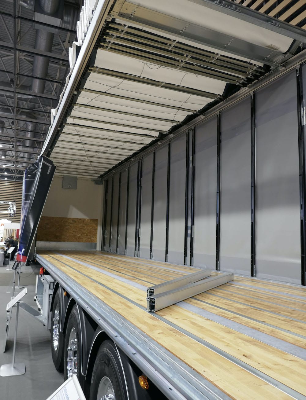 Pour les bennes, Fruehauf avait également mis en avant sur son stand un bâchage avec jupe en demi-lune. Cela est annoncé comme facilitant le bâchage du dernier mètre, ce qui assure une meilleure sécurité des autres usagers de la route, le tout sans avoir à descendre du véhicule. Comme pour le Top Slide, Fruehauf met également le gain de temps pour le conducteur. Cette jupe en demi-lune est conçue sans pièces mécaniques, ce qui réduit la maintenance. Les arceaux recouvrent l’intégralité de la caisse et permettent un recouvrement total de la porte.