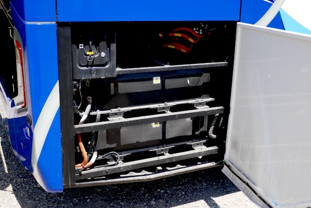 Voith fournit avec son environnement VEDS les convertisseurs de courant (également à refroidissement liquide) et l’unité de pilotage pour la chaîne de traction. Héritage de la culture ferroviaire de Voith, le convertisseur de courant IGBT travaille sous 1200 V (voltagedes circuits haute tension 700V). Le parcours était relativement facile et effectué avec huit personnes à bord, mais il a mis en exergue l’excellence des accélérations et de la régénération de l’énergie cinétique à la décélération. Le levier de commande est particulièrement bien placé et pratique. Le conducteur n’aura plus pour la maintenance de la chaîne de traction qu’à surveiller les vases d’expansion de liquide de refroidissement situés à l’arrière de l’autocar, lesquels sont aisément accessibles et visibles.
