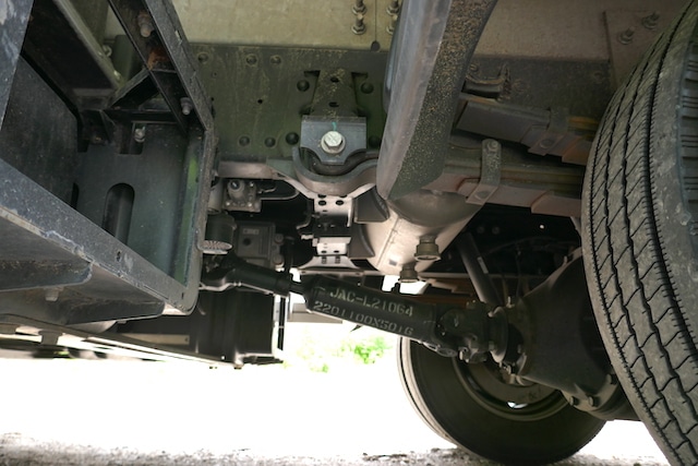 Sur ce sujet, JAC Motors ne lésine pas : c’est un véritable freinage de camion ! On retrouve donc un double circuit à actionnement pneumatique avec dessiccateur d’air et compresseur dédié. Le montage de série comprend des disques à l’avant et des tambours à l’arrière. L’équipement sécuritaire obligatoire est là pour veiller en cas de besoin : on retrouve l’ABS, l’AEBS et un ESP. Point positif, l’aide au démarrage en côte (Hill holder) retient le véhicule jusqu’à ce que l’on accélère. Il n’y a pas de limite de temps, c’est très appréciable sur certaines montées, en manœuvres ou dans des bouchons (généreusement créés par la Métropole de Lyon dans la montée de la Boucle menant vers la Croix-Rousse). C’est bien plus sécurisant et instinctif que ces piégeux systèmes d’aide au démarrage en côte temporisés que d’autres marques de camions nous infligent. Il s’active automatiquement (une fois que le bouton de présélection est enclenché) dès que l’on maintient plus d’une seconde la pédale de freins enfoncée de façon constante ou lors d’un enfoncement fort de celle-ci. Un fonctionnement qui rappelle celui des systèmes montés sur les autobus urbains. L’enclenchement du système pneumatique s’entend clairement et est confirmé par le témoin idoine au tableau de bord.