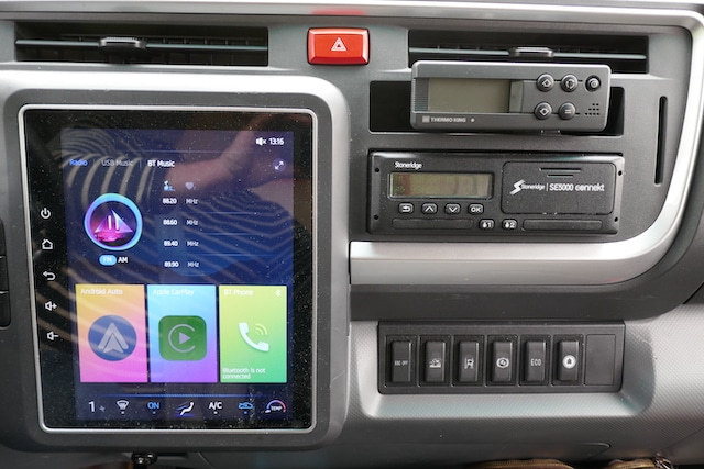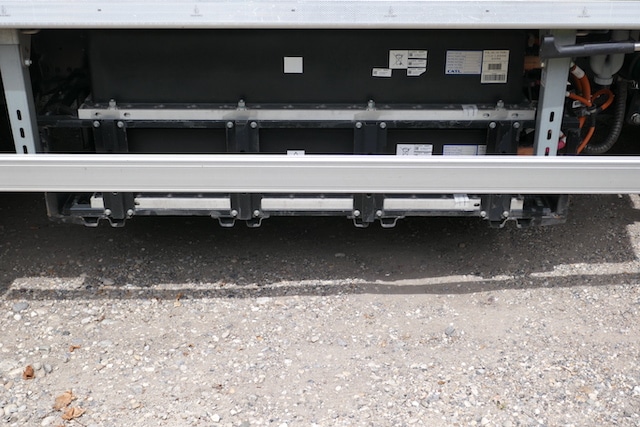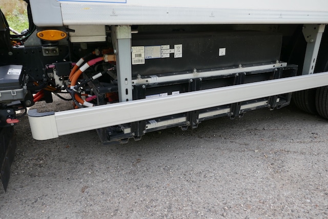 Pour les équipements de carrosserie, une alimentation dite ePTO d’une puissance de 18kW en courant continu (DC) est montée en série. Le modèle était équipé en carrosserie frigorifique Lecapitaine dotée d’une porte à double battants à l’arrière et d’une porte latérale simple côté droit. Sa finition est excellente. Le groupe froid de type poulie-moteur, situé en face avant de caisse est un Thermo King V-800 associé à une unité électrique de l’équipementier Add Volt chargée d’assurer l’autonomie électrique pour l’entraînement du groupe froid sans impacter la chaîne de traction. Pour les livraisons, l’ensemble est complété par un hayon électro-hydraulique rétractable Dhollandia DHLM10 de 1000 kg de capacité de charge. Un combo classique pour la livraison urbaine, pour la restauration collective ou les marchés. Les livreurs vont apprécier le fait que la cabine soit basse et, de fait, l’accessibilité est excellente. Un vrai plus au quotidien pour celles et ceux qui ne cessent de monter et descendre de leur camion. Le véhicule carrossé pèse 4970kg (5045kg en ordre de marche) ce qui laisse une charge utile nette de 2445kg. Un résultat très honorable pour un véhicule électrique à batteries équipé d’une carrosserie frigorifique sous température dirigée. La longueur totale est de 6.32 m pour une largeur de 2.3 m. On apprécie la maniabilité de l’ensemble, bien aidée par le concept de cabine avancée. On s’est même offert le luxe d’un authentique créneau. Le rapport longueur-utile/encombrement hors-tout est clairement un atout majeur du modèle qui prouve que les petits camions à cabine avancée de 7.5t ont une vraie pertinence en milieu étroit. On note que Tekauto travaille avec de nombreux carrossiers, sans exclusive.
