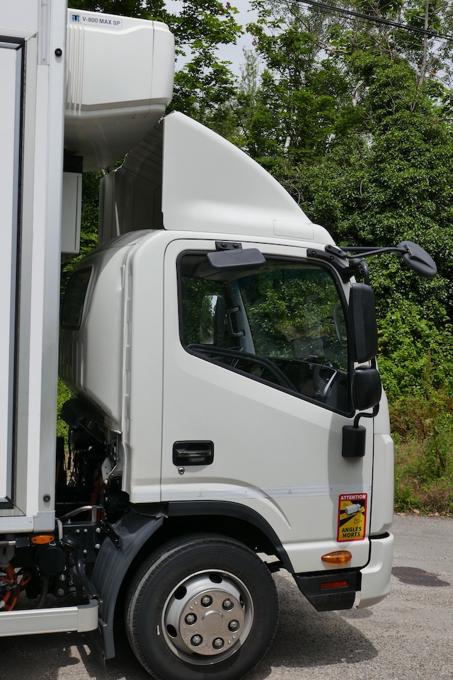 Plus rustique, tu meurs ! Essieux et ponts rigides avec ressorts à lames : c’est service minimum à ce chapitre. Aucune option de suspension pneumatique avec fonction de nivellement n’est proposée, ce qui est regrettable et peut constituer une limite pour certains métiers ou carrosseries. La monte pneumatique, d’origine chinoise Prime Well PW212 est en 215/75 R 17.5 en indices 126/124 M avec monte jumelée à l’arrière. Les capacités techniques sont de 3.1 t à l’avant et de 6.2 t à l’arrière. On le voit : à 7.5t de PTAC homologué, il y a encore beaucoup de marge technique. Cette marge technique n’est pas malvenue sur le modèle de la prise en mains en raison de la présence du groupe froid et de son pack de batteries fourni par le spécialiste portugais Add Volt sur la face avant de la carrosserie. On retrouve un classique boîtier de direction, avec une assistance électro-hydraulique. Là encore, rien que du classique, même pour un véhicule électrique. Le rayon de braquage apparaît extrêmement favorable. Ceci s’explique par la faiblesse du porte-à-faux (1110 mm) et le rapport entre longueur hors-tout et empattement.