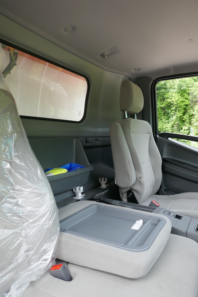 Peut mieux faire, tant dans le ressenti que dans l’optimisation de l’espace sur le véhicule. On attend avec impatience la version correspondant à la génération GSR-II qui apparaîtra à la fin de l’année 2024. Notre sentiment mitigé sur l’agrément de la transmission vient du temps de latence, perceptible lors du passage entre 1er et 2ème rapport de la boîte robotisée. Passage se situant aux environs de 30 km/h et est assez marqué. Ce choix est lié aux origines du camion : à la base c’est un 9 t de PTAC. Pour cette charge totale, avec cette même machine tournante, les 2 rapports sont quasiment indispensables.