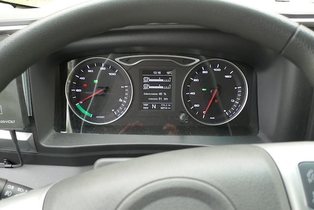 Par contre, la libération du dispositif manque un peu de finesse. La progressivité est excellente en début de freinage, mais une fois proche de l’immobilisation, il est difficile d’obtenir une parfaite douceur jusqu’à l‘arrêt complet. On déplore la commande de frein de parc électrique qui peut s’actionner par inadvertance. Un meilleur positionnement de la petite palette de commande pourrait résoudre ce souci. La prise en mains s’étant effectuée à vide, nous ne pouvons pas nous prononcer sur l’efficience du système au PTAC maximal mais la puissance de freinage semble généreuse. L’atout, typique des véhicules électriques, tient à la régénération de l’énergie cinétique assurée par la machine tournante. Ce n’est pas spectaculaire mais plaisant. Pour demander davantage de retenue, il faut appuyer sur la pédale de freins comme sur les autobus urbains. La régénération est alors pilotée automatiquement par le système de freinage coopératif. On pourrait suggérer un levier à l’image d’un ralentisseur conventionnel, peut-être plus familier des conducteurs de camions (mais moins de ceux d’utilitaires). La régénération de l’énergie cinétique est signalée au tableau de bord. Cette fonction est disponible dès que les batteries sont au seuil de 95%. Inutile donc de charger à 100% (à moins que vous ne commenciez vos tournées par des montées).
