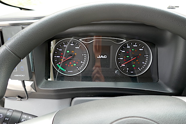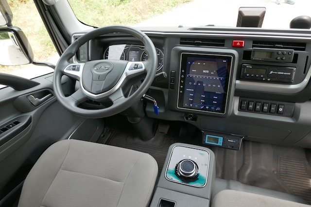 Toujours pour faire moderne, et sans doute pour gagner en encombrement, JAC Motors a choisi une commande de frein de parc électrique. Bien placée, plutôt intuitive, celle-ci a pu être enclenchée par inadvertance lors de notre prise en mains. Fâcheux. Mais puisqu’il s’agit de gagner de la place, pourquoi diable les concepteurs ont-ils dessiné une console centrale aussi envahissante pour porter uniquement la molette de sélection des sens de marche ? Ce meuble encombrant ne comprend même pas de coffre de rangement ou de porte-cartes. Le chronotachygraphe obligatoire (nous sommes ici en présence d’un 7.5t rappelons-le) est aisément accessible mais, de fait, prend la seule et unique place disponible prévue pour un vide-poches au format DIN. L’afficheur de bord, par ailleurs très lisible et bien agencé, nous a gratifié d’une frayeur avec une réduction drastique et soudaine de l’autonomie alors que l’énergie restante dans les batteries descendait de façon extrêmement mesurée. Autre fantaisie, le blocage mystérieux de l’inverseur code-phares en plein phares pendant quelques minutes. L’insonorisation apparaît bonne, tout au moins tant que l’on ne baisse pas les vitres. Les interrupteurs des diverses fonctions annexes sont aisément accessibles pour les grands gabarits, les « petits bras » pourraient ne pas être du même avis. Hormis cette réserve, l’ergonomie des commandes apparaît bonne (il nous a été facile d’utiliser et de couper le programmateur de vitesse par exemple).