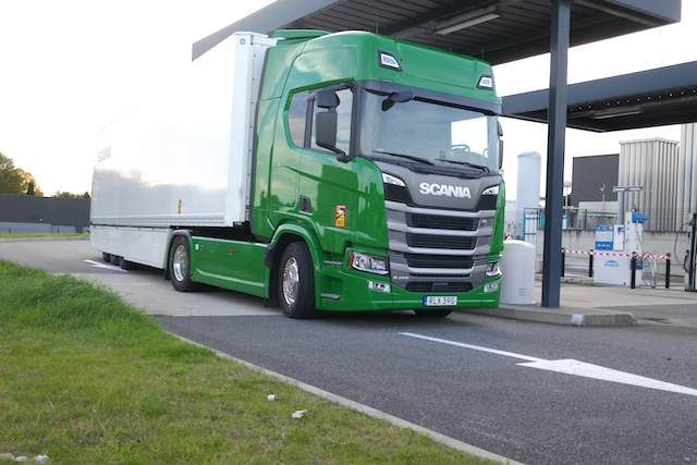 Le tracteur de la prise en mains annonçait un empattement de 3850 mm, ce qui permet de conserver l’usage des semi-remorques actuelles sans arriver aux limites de la couronne de giration européenne. C’est un avantage des tracteurs GNV par rapport aux modèles à batteries exigeant des empattements plus longs, voire des configurations de tracteurs à 3 essieux. Mais attention, en fonction des différentes capacités demandées pour le stockage, les empattements de ce tracteur peuvent varier dans de notables proportions (de 3750 mm jusqu’à 3950 mm suivant la quantité de GNC stocké et le type de suspension monté à l’arrière). Selon la fiche technique, nous avions à bord 4x118dm3 en côté droit, et 3×152 plus 1x132dm3 en côté gauche soit un total théorique de 169kg de méthane sous 200 bar de pression. Scania peut aller jusqu’à équiper sur demande le dos cabine de bouteilles supplémentaires afin de définir un véhicule « maxi autonomie », un cas de figure certainement plus approprié aux porteurs-remorquants. Parmi les précautions utiles à prendre lors de la configuration du véhicule, il faut spécifier la possibilité d’opter pour des orifices de remplissages NGV1 et NGV2. Cette précaution est hautement recommandable en cas d’indisponibilité de l’un ou l’autre des embouts en station.