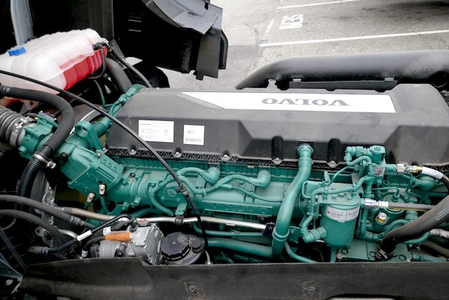 La nouveauté est la commercialisation d’une version de 500ch de ce moteur qui existait déjà depuis 2018 en versions 420 et 460ch. Cette puissance est atteinte aux environs de 1350tr/mn et conservée jusqu’à 1760tr/mn. Pour le couple, Volvo établit la référence des véhicules GNV : 2500Nm entre 980 et 1400tr/mn. La meilleure consommation spécifique est annoncée entre 1050 et 1300 tr/mn. L’attelage mobile (bielles, pistons, vilebrequin) ont été revus lors du passage à la norme Euro VI-E pour réduire les pertes par frottements. Le recyclage des gaz de carter a vu sa gestion modifiée. Un nouveau turbo-compresseur à géométrie variable, destiné à réduire le temps d’amorçage, a fait également son apparition avec Euro VI-E. La pompe à huile est à débit variable. La firme évoque également une optimisation du système de post-traitement, sans donner de détails. Il combine catalyse SCR à réactif AdBlue avec la recirculation EGR et les traditionnels catalyseurs d’oxydation et filtres à particules.